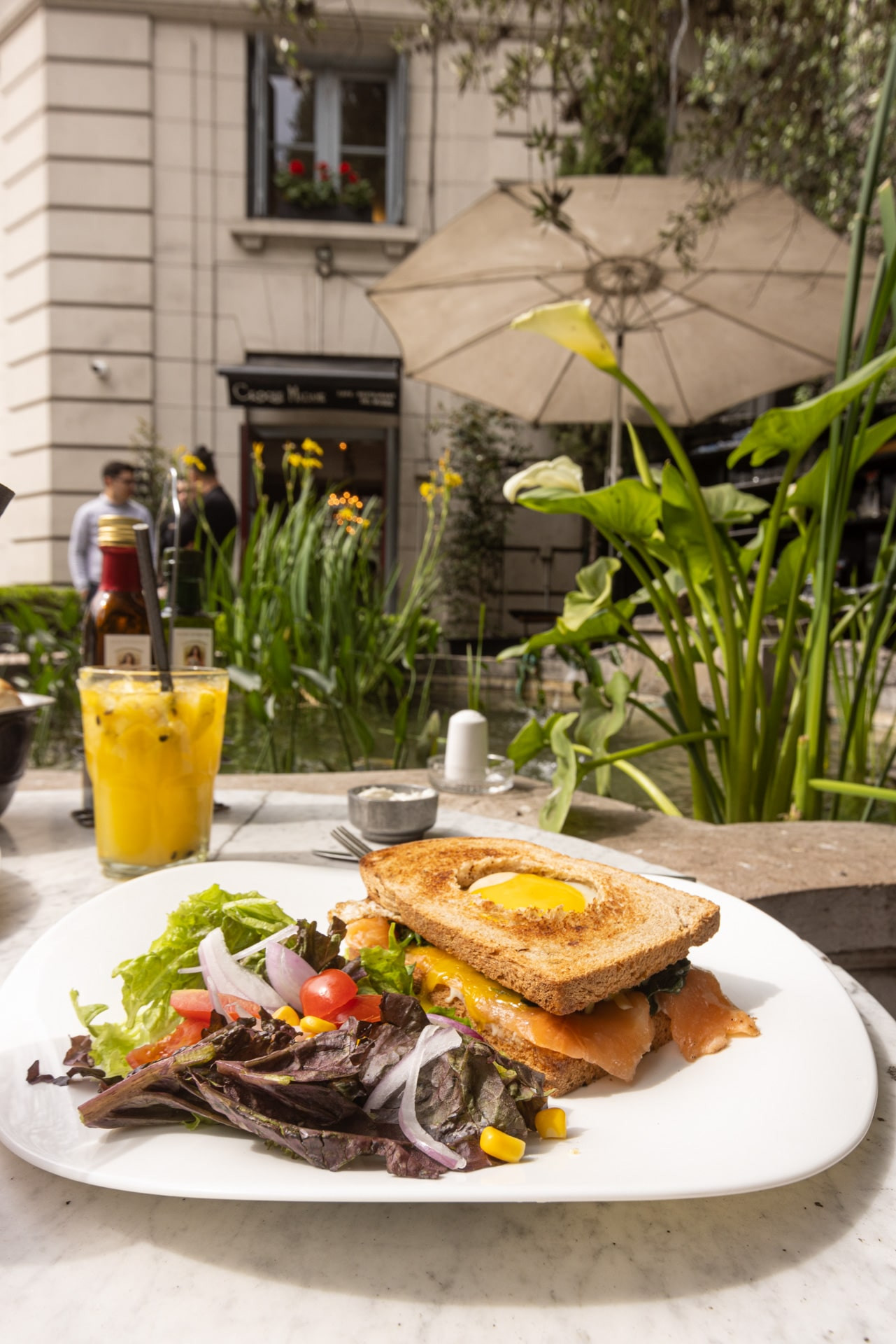 Café o té a elección, Jugo de naranja o limonada, Croque a elección